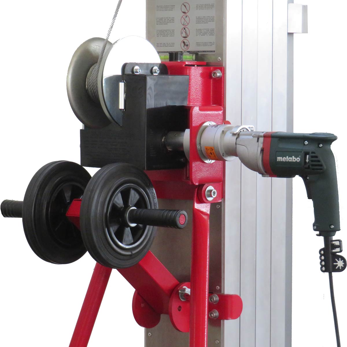 Convierte tu elevador telescópico manual en un sistema eléctrico que reduce el esfuerzo físico y agiliza cada montaje. Este accesorio sustituye el cabestrante manual e incorpora un taladro Metabo con reductor y adaptador, que fija el taladro al elevador sin necesidad de sujetarlo, permitiendo al instalador trabajar con una sola mano.